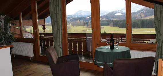 Vom Wohnbereich aus erreichen Sie den großen, überdachten Westbalkon. Von hier haben Sie einen herrlichen Ausblick übers Tal und auf die Oberstdorfer Berge.